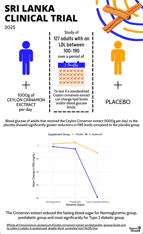 Yes, Ceylon cinnamon may help support healthy blood sugar levels. A 2025 clinical trial published in PLOS ONE found that participants who consumed our Ceylon cinnamon extract daily experienced significant reductions in fasting blood glucose levels compared to a placebo group.